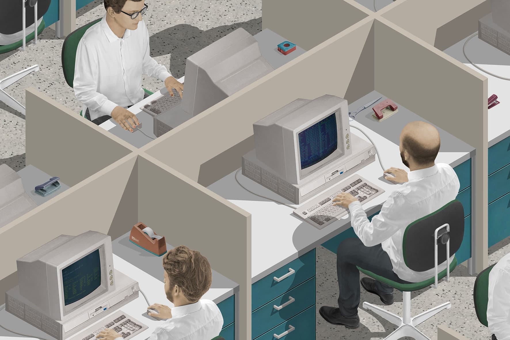 Mais il n'y a pas que du cosy dans l'héritage Sims. Nicoleta Mureş, artiste roumaine installée à Madrid, explore l'aspect le plus inquiétant de cette esthétique. Ses bureaux dystopiques qui évoquent Severance autant que Matrix puisent directement dans ses souvenirs de « petites cruautés ludiques » : « Il y avait quelque chose de perversement amusant dans ces actes de torture virtuelle. »